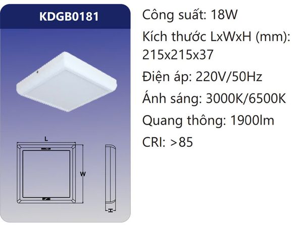ĐÈN GẮN NỔI VIỀN VUÔNG LED 18W DUHAL KDGB0181 với kiểu dáng đẹp, mẫu mã được thiết kế tinh tế mang lại sự cao cấp, sang trọng cho không gian chiếu sáng và trang trí. Nguồn sáng mạnh làm nổi bật không gian chiếu sáng. Sử dụng chip LED chất lượng cao, tuổi thọ 50.000 giờ, Tiết kiệm 80% điện năng tiêu thụ so với đèn huỳnh quang. Chỉ số hoàn màu cao. Được ứng dụng rộng rãi vào các lĩnh vực chiếu sáng như chiếu sáng văn phòng, công sở, chiếu sáng nhà ở, trường học, trung tâm thương mại, đáp ứng được yêu cầu tiết kiệm điện và mang lại hiệu quả chiếu sáng tốt nhất.